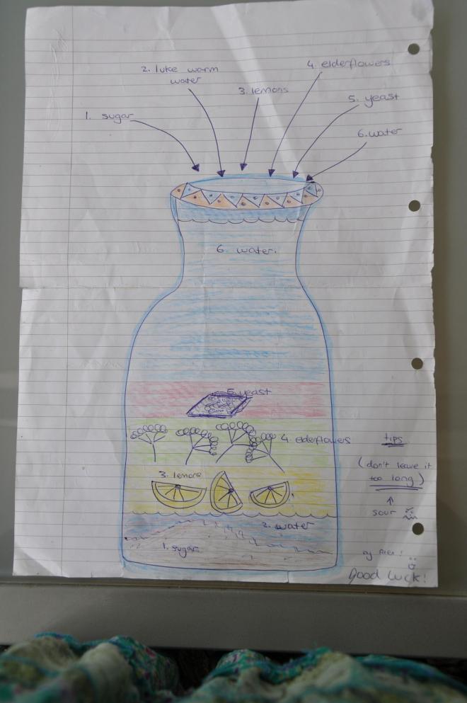I got this recipe from a friend who is a natural master chef extrodinaire and her daughter, Alexandra, drew me up this pretty diagram to help me on my merry way to making the delicious summer drink, I find it a  very useful reference picture in the potion making process.