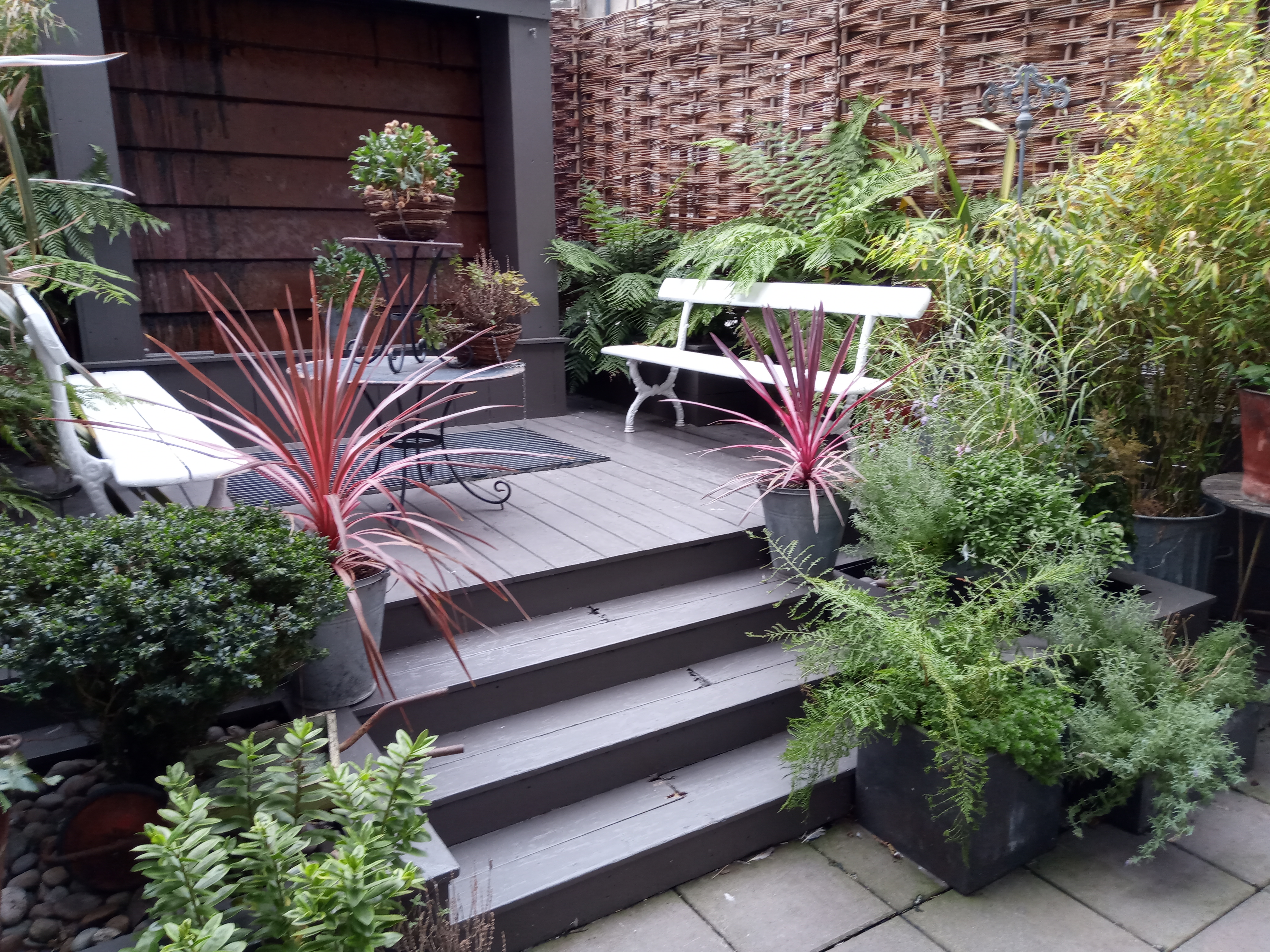 “Fire and Water” A characterful patio, created for a plant loving couple, with not a lot of free time on their hands. This low maintenance garden embraces their personalities, whilst offering tranquil places to sit and enjoy precious down time amongst the plants with a chat, cup of coffee or a cocktail.